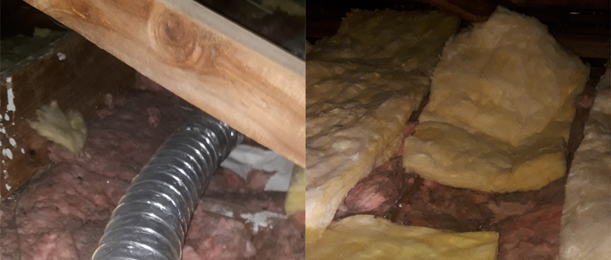 As you can see in the photos, there are many gaps in the new yellow insulation, which has been laid over the top of the existing pink insulation. The new insulation is also not the right R-value and a label has not been left to identify it.