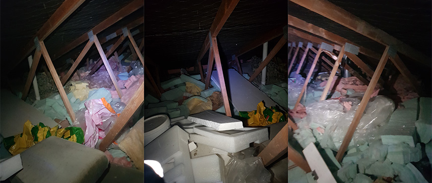 On inspection, we found a complete mess of insulation offcuts and plastic packaging just strewn through the ceiling. The photo above is a good illustration of what we found.